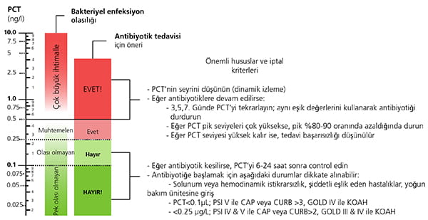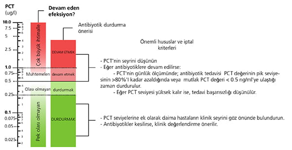 Kan kültürü sonuçlarının çıkması günler sürebileceği ve infeksiyonlarda sınırlı bir tanısal doğrulukla ilişkili olduğu için, PCT düzeyleri klinisyenin infeksiyondan şüphelenilen hastalarda antibiyotik tedavisine başlamasına yardımcı olabilir [3-5].